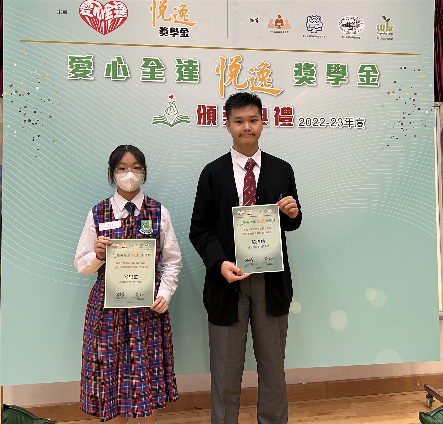 恭賀2A岑思華同學榮獲2022-2023年度「愛心全達 - 悅逸獎學金」力爭上游最顯著進步奬 (中學組)及6D蔡坤佑榮獲2022-2023年度「愛心全達 - 悅逸獎學金」自強不息優秀表現獎(中學組)。