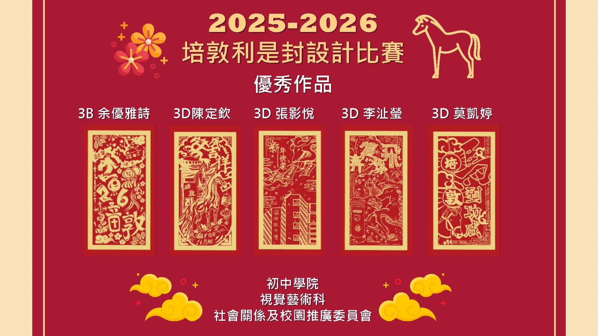 由初中學院、視覺藝術科和社區關係及校園推廣委員會跨部門協作舉辦的培敦利是封設計比賽已圓滿結束。經過校長、助理校長及視藝科老師的評分,並結合全校同學參與的投票結果,五款優秀作品分別為3B余優雅詩、3D陳定欽、3D張影悅、3D李沚瑩及3D莫凱婷的創作。利是封以馬年作為設計主題,加入本校特色及聖經經文。這些優秀作品已印刷成利是封,作為別具意義的培敦紀念品,並與一眾教職員及學生分享喜樂。