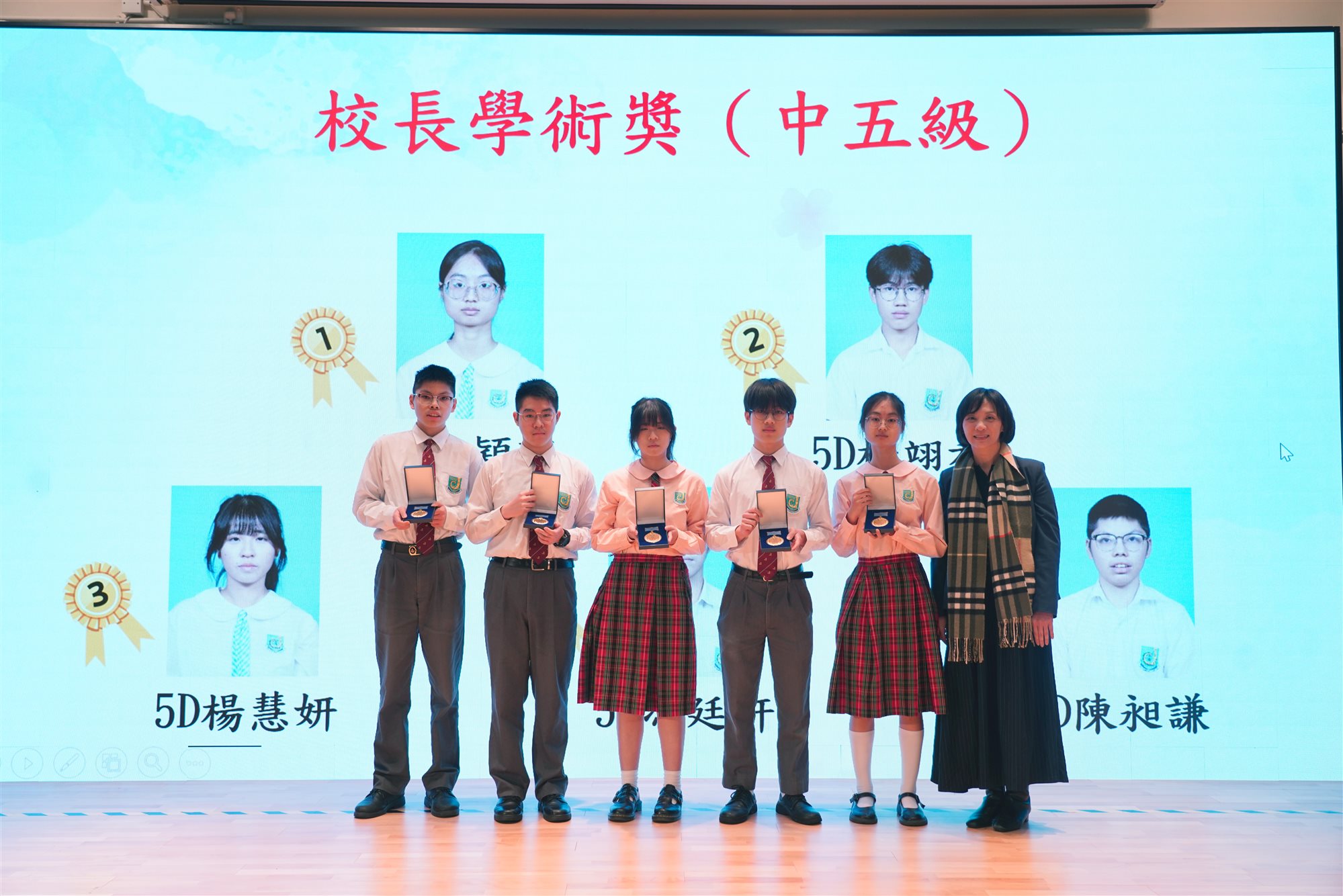 中五級:5D李穎珊、5D楊翊希、5D楊慧妍、5A馮廷軒、5D陳昶謙