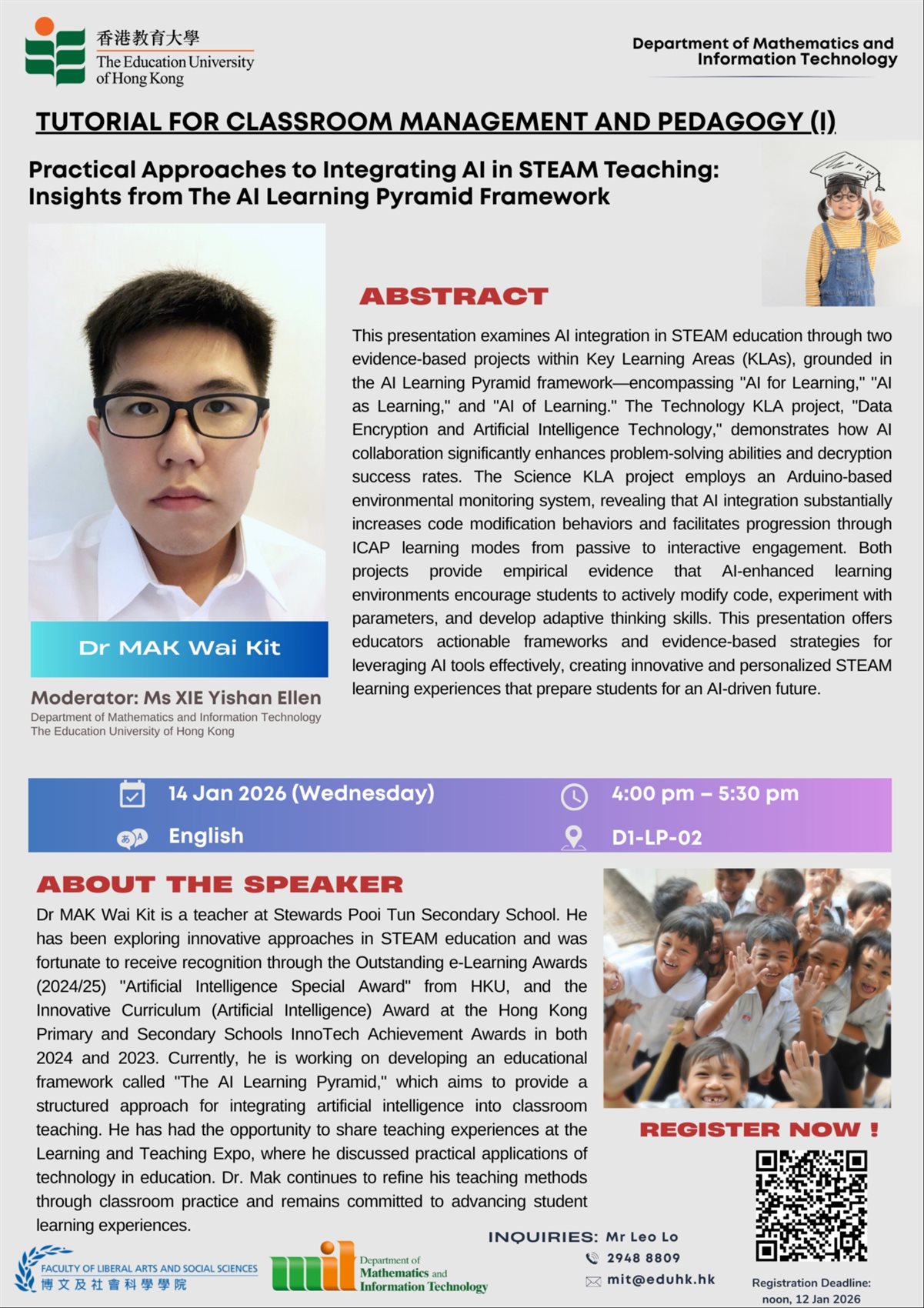 本校STEM科教師麥偉傑博士於2026年1月14日代表學校前往香港教育大學數學與資訊科技學系舉辦「課堂管理與教學法」工作坊,擔任主講嘉賓分享「將人工智能融入STEAM教學的實用方法:來自AI學習金字塔框架的見解」。
