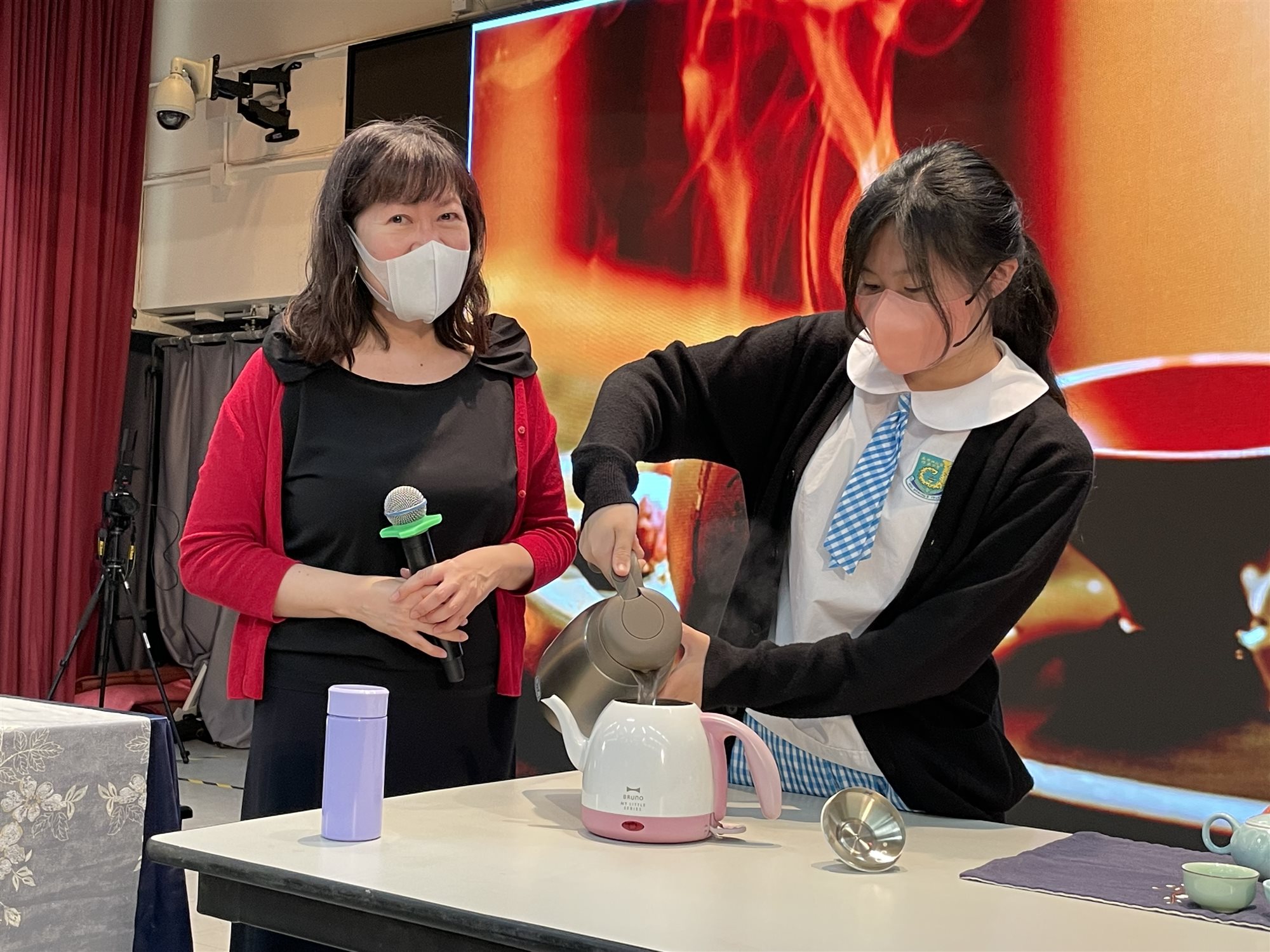 同學在黃汶貞老師指導下嘗試冲泡茗茶,甚有功架。