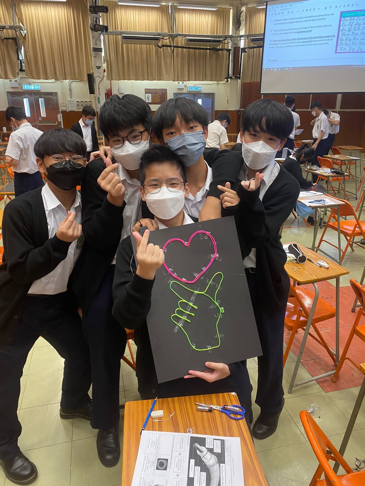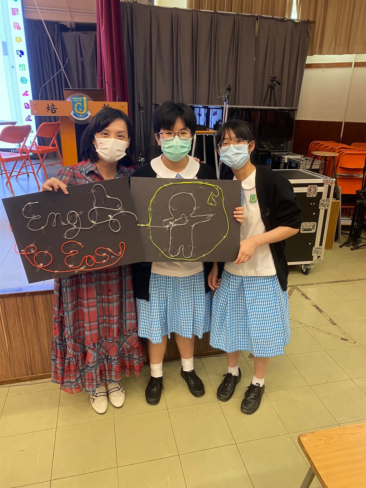 中四級同學正在親自製作的熒光板前展演其愛心及祝福。